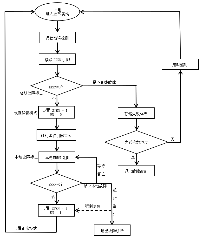ECU節(jié)點(diǎn)上電啟動后SIT1043Q進(jìn)入正常模式,在正常模式下MCU微控制器通過讀取引腳ERRN電平,來進(jìn)行總線故障診斷。如果獲取到ERRN=0,則通信故障是由總線故障引起,MCU控制器置位總線故障通信失敗錯誤標(biāo)志。如果獲取到ERRN=1,則控制器復(fù)位總線故障通信失敗錯誤標(biāo)志。這時如果MCU控制器強(qiáng)制SIT1043Q進(jìn)入到靜音模式,在靜音模式下,如果控制器獲取到ERRN=0,則可以診斷位本地故障。如果進(jìn)一步獲取本地故障的哪一個類別(比如TXD顯性超時或總線顯性超時),可以由控制器操作RXD=0&TXD=1或者RXD=1進(jìn)一步識別。