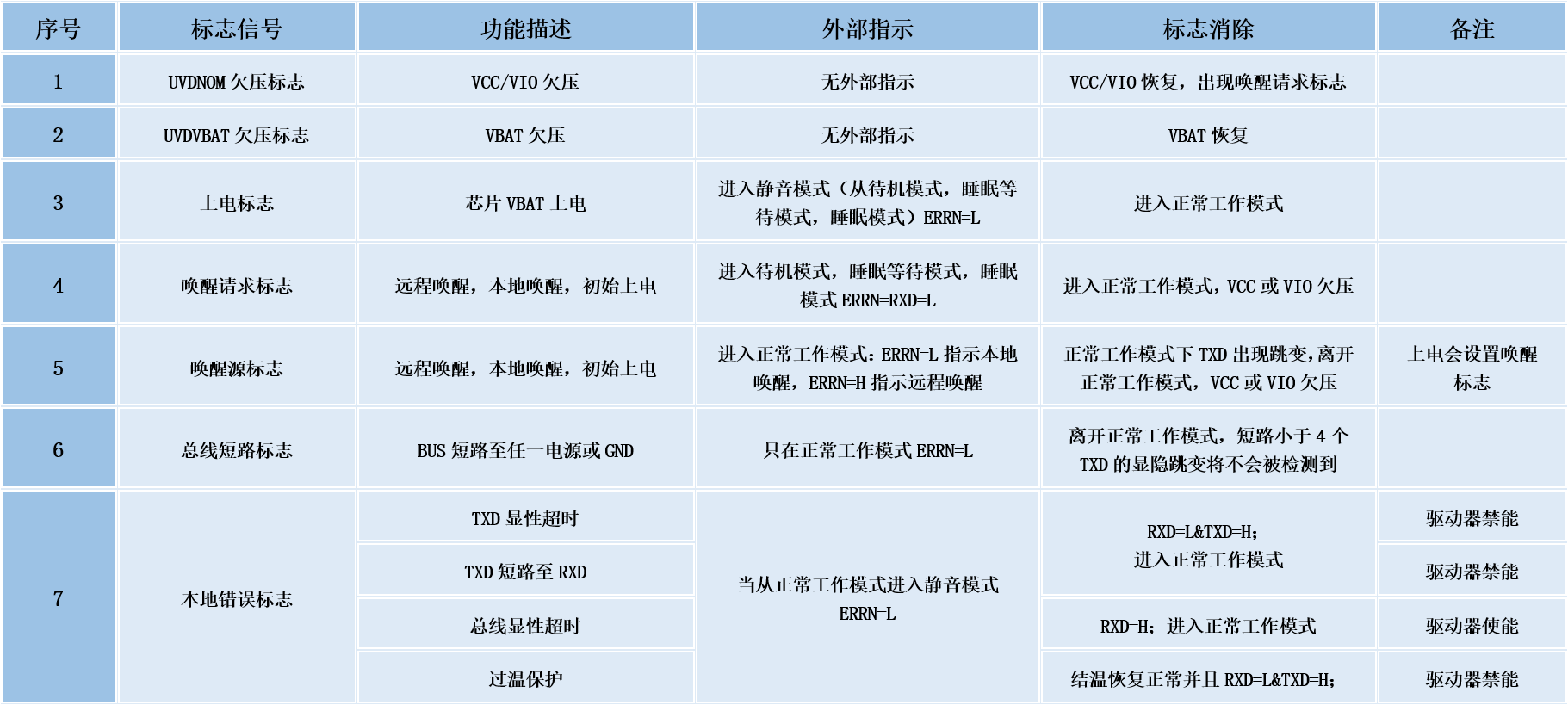 SIT1043Q使用7個內(nèi)部標(biāo)志來實(shí)現(xiàn)故障安全的回退模式控制和系統(tǒng)診斷。主控制器可以通過引腳ERR_N輪詢其中的五個標(biāo)志,功能標(biāo)志執(zhí)行操作如下表1所示。