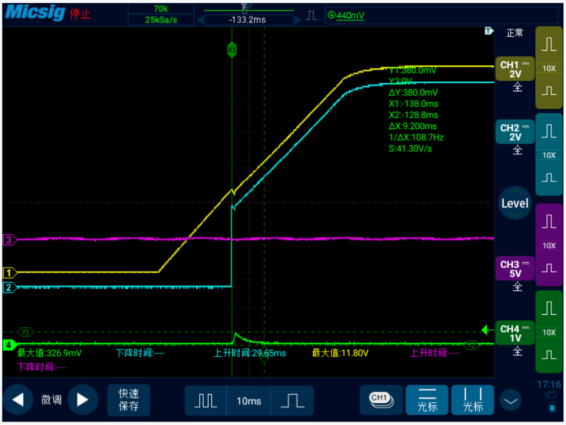 干擾幅值(綠色通道)由原來的2.8V降低為0.33V左右,此時(shí)INH(藍(lán)色通道)輸出高,各功能均能正常工作。