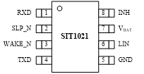 SIT1021具有超低功耗休眠模式,芯片在休眠模式下,流過VBAT腳電流典型值僅為3uA;SLP_N腳控制芯片進(jìn)入正常工作模式和休眠模式,當(dāng)SLP_N腳為高電平時(shí),芯片進(jìn)入正常工作模式;當(dāng)SLP_N腳為低電平時(shí),芯片進(jìn)入休眠模式;SLP_N腳內(nèi)置弱下拉(國外同類芯片一樣內(nèi)置弱下拉),較容易受外界干擾影響,上電后用手觸摸此管腳能夠引起芯片進(jìn)入正常工作模式;這樣如果在干擾比較強(qiáng)的應(yīng)用環(huán)境中SLP_N端口可能會(huì)受干擾被誤觸發(fā),造成功能不良。SIT1021管腳圖如下: