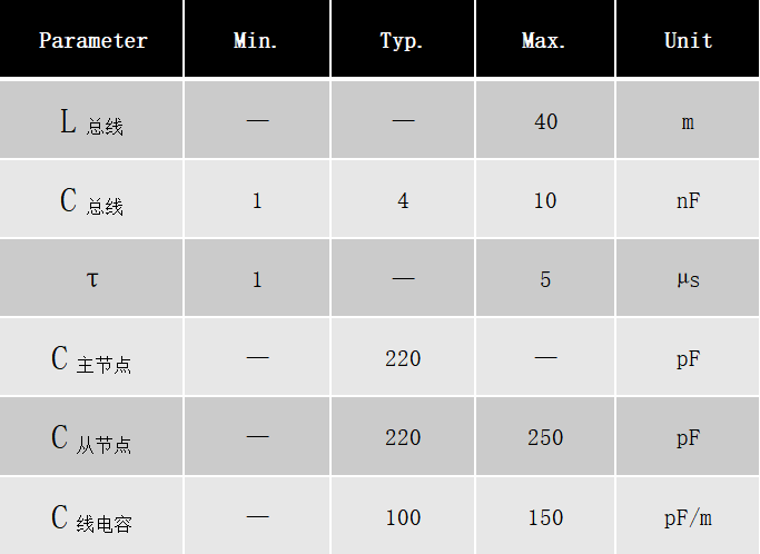 RC時間常數(shù)(τ)、主從節(jié)點電容(C主節(jié)點、C從節(jié)點)、總線上的等效總電容(C總線)、線電容(C線電容)、總線長度(L總線):