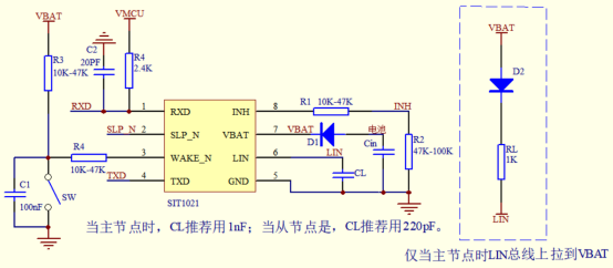 SIT1021在待機(jī)模式、正常模式和上電模式下,INH腳輸出都是高電平(電壓幅值與VBAT相同),只有在休眠模式下輸出才是浮空狀態(tài);如果需要INH腳控制外部電源管理模塊,則需將此腳通過電阻下拉到地看,如下圖,考慮到功耗,下拉電阻R2推薦使用100K(如果電源管理模塊使能腳內(nèi)部未接下拉電阻,則需要外接下拉電阻,如果內(nèi)部有接下拉電阻,則可根據(jù)實(shí)際應(yīng)用來決定是否外部加下拉電阻);可根據(jù)電源管理模塊使能腳耐壓,調(diào)節(jié)R1和R2的阻值,以調(diào)節(jié)輸出到電源管理模塊的使能腳電壓。如果不用此功能可以通過電阻上拉到VBAT,或者懸空。應(yīng)用時(shí)應(yīng)注意,芯片上電后,需將SLP_N腳置高使芯片進(jìn)入正常模式后,才能將其設(shè)置在休眠模式,如上電后直接將SLP_N腳置低,則無法進(jìn)入休眠模式;另外休眠模式與正常模式可以通過設(shè)置SLP_N腳來回轉(zhuǎn)換;如果在休眠模式下,通過本地喚醒或者遠(yuǎn)程喚醒后,SIT1021先進(jìn)入待機(jī)模式,同時(shí)RXD輸出喚醒標(biāo)志(置低),TXD輸出喚醒源標(biāo)志(置低(弱下拉代表遠(yuǎn)程喚醒,強(qiáng)下拉代表本地喚醒));當(dāng)MCU檢測(cè)到喚醒標(biāo)志后,通過喚醒源標(biāo)志檢測(cè)到喚醒源,控制SLP_N置高,進(jìn)入正常模式,接收數(shù)據(jù)。