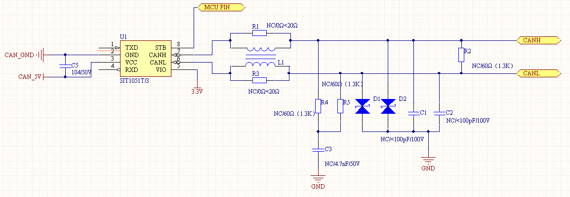 CANH 和 CANL 輸出到 GND 的一對(duì)匹配電容用于提高抗電磁干擾的性能。相應(yīng)噪聲源的阻抗和 CANH 和 CANL 對(duì)地的電容組成了一個(gè) RC 低通濾波器。電容值必須由節(jié)點(diǎn)的數(shù)量和數(shù)據(jù)傳輸頻率決定。一般選取<100pF,如果外接 ESD 保護(hù)器件,該電容值可適當(dāng)減小或省掉。圖中串聯(lián)電阻可調(diào)整與對(duì)地電容形成的低通濾波器性能,但電阻值不應(yīng)過(guò)大,導(dǎo)致顯性差分電壓值降低明顯。